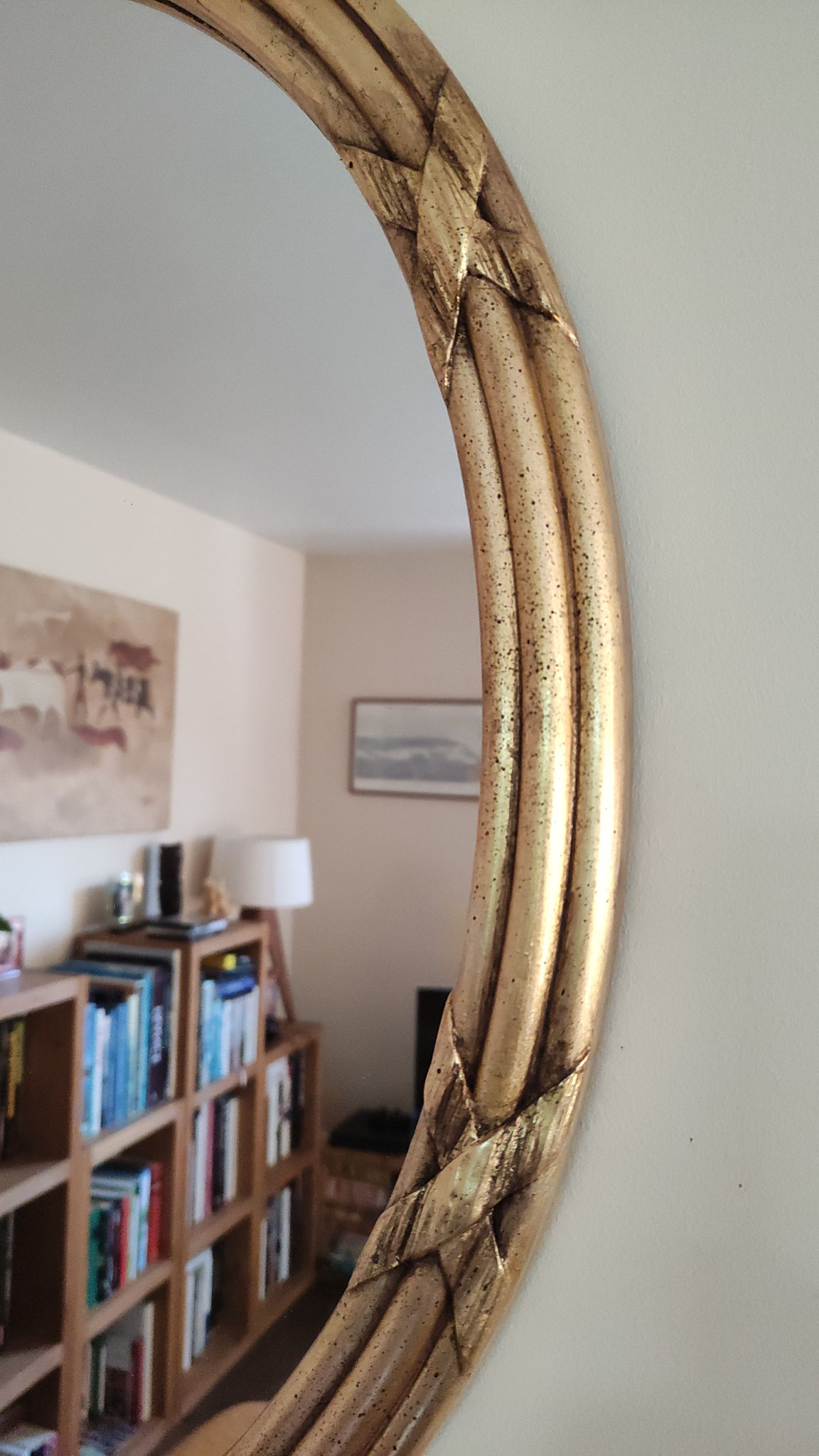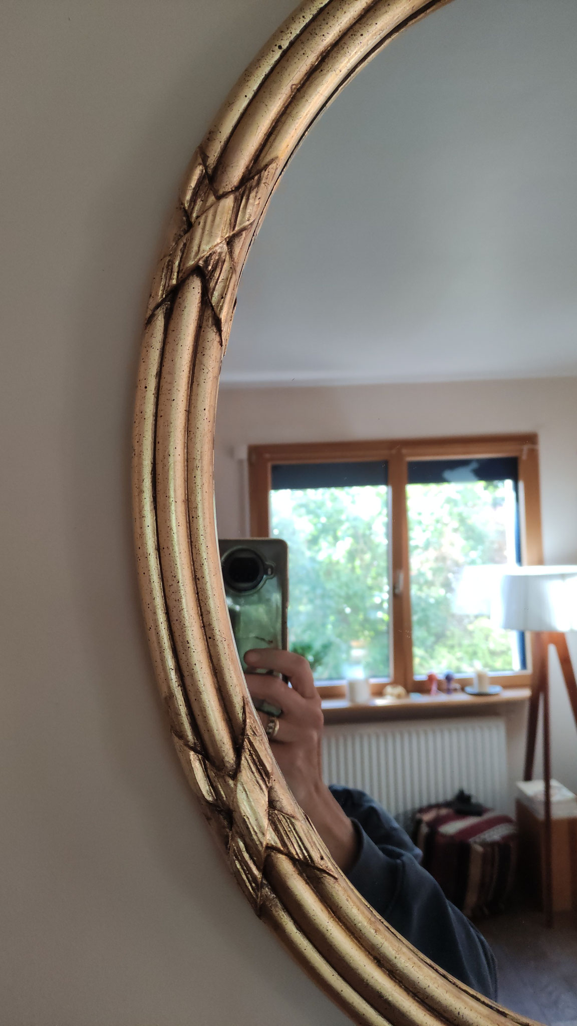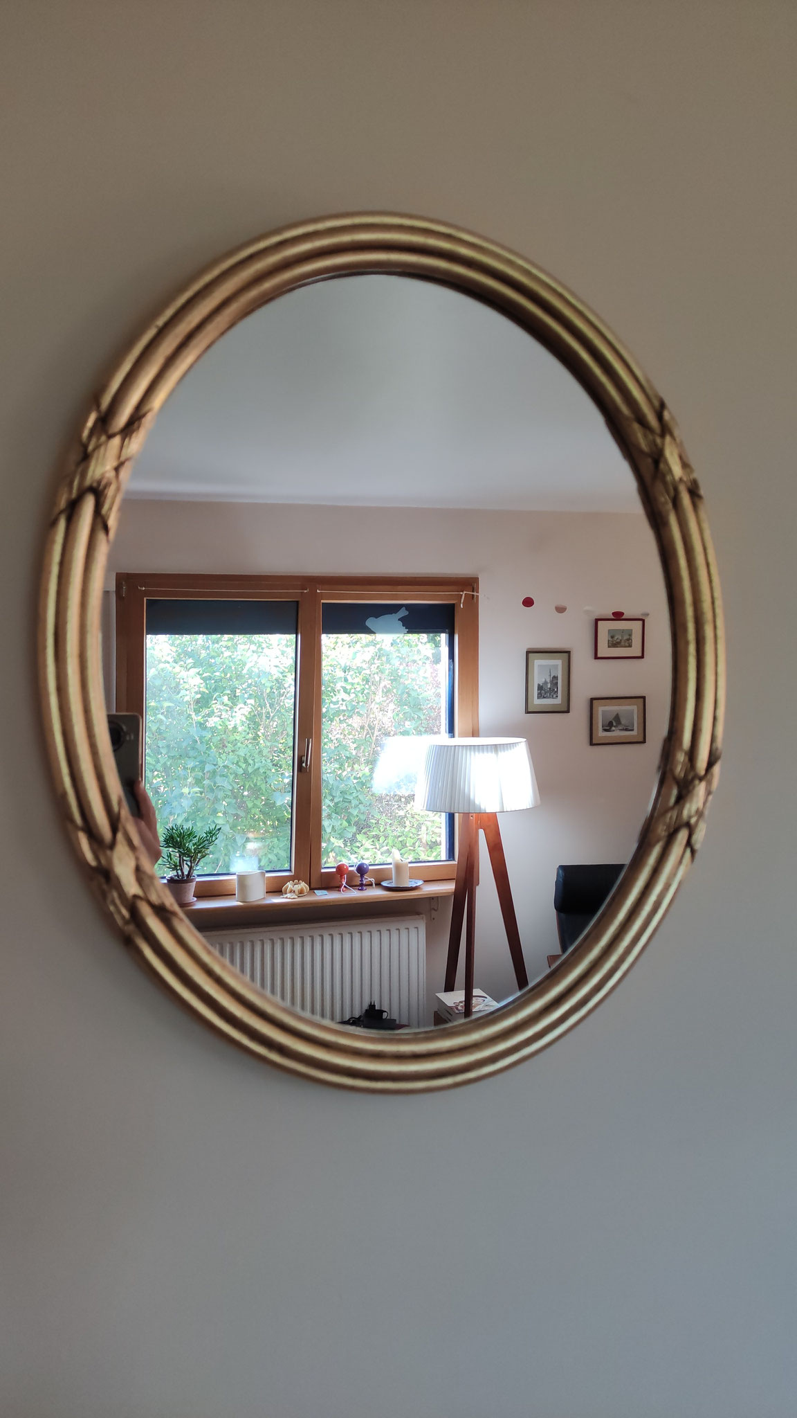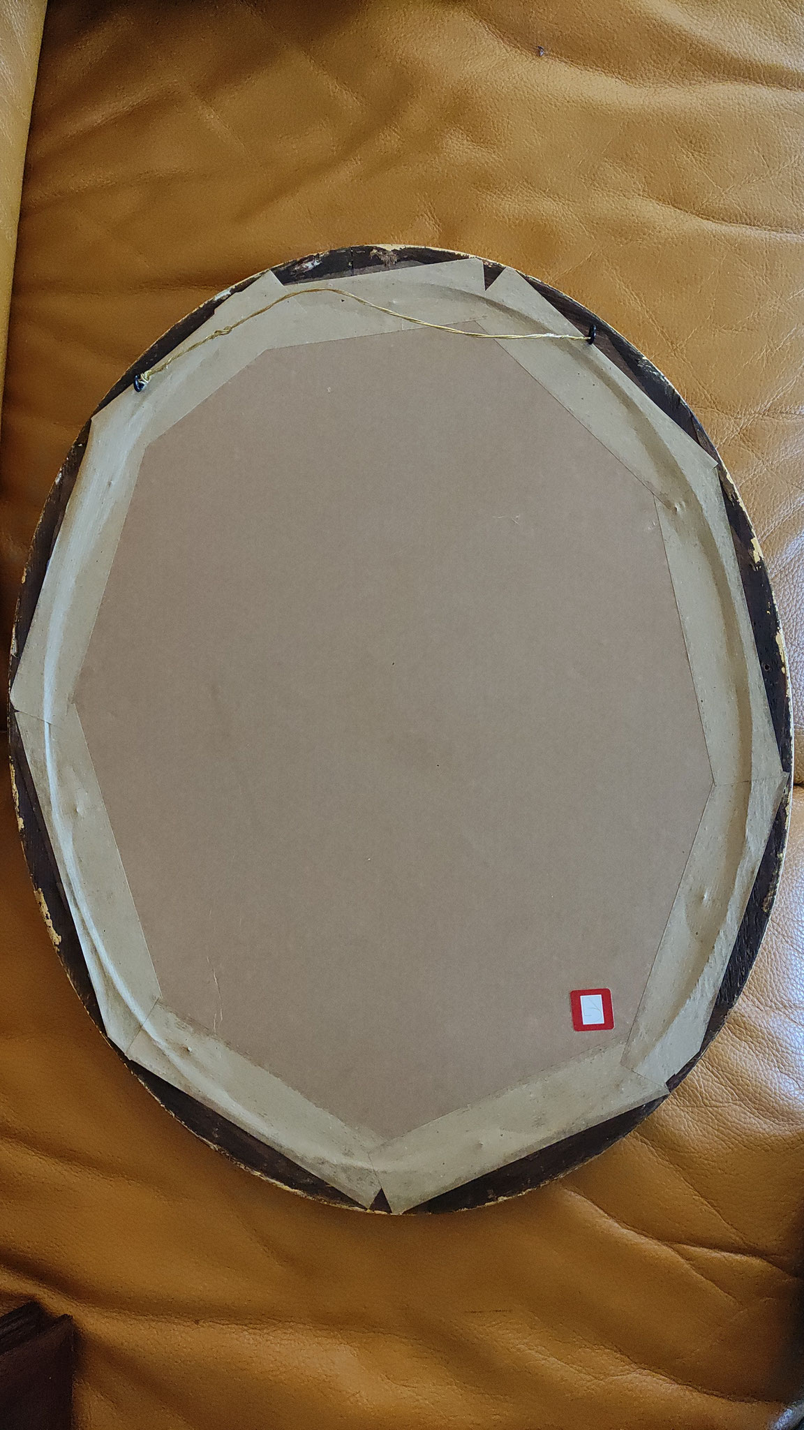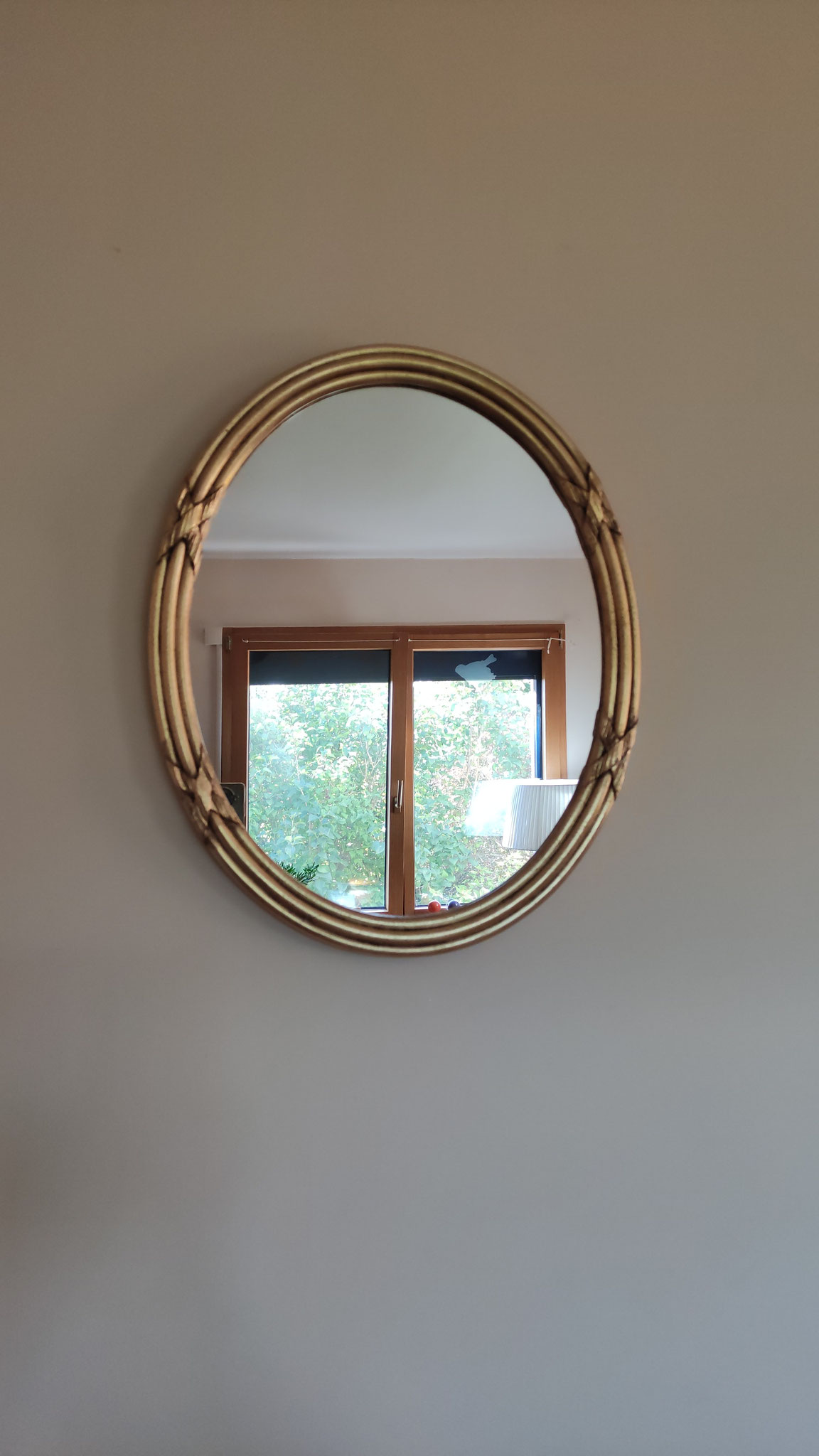 Miroir dans un cadre ancien (XIXe siècle), oval, avec rubans, entièrement restauré à la feuille d'or et de cuivre.